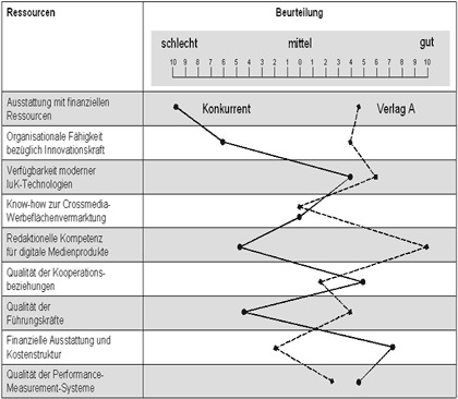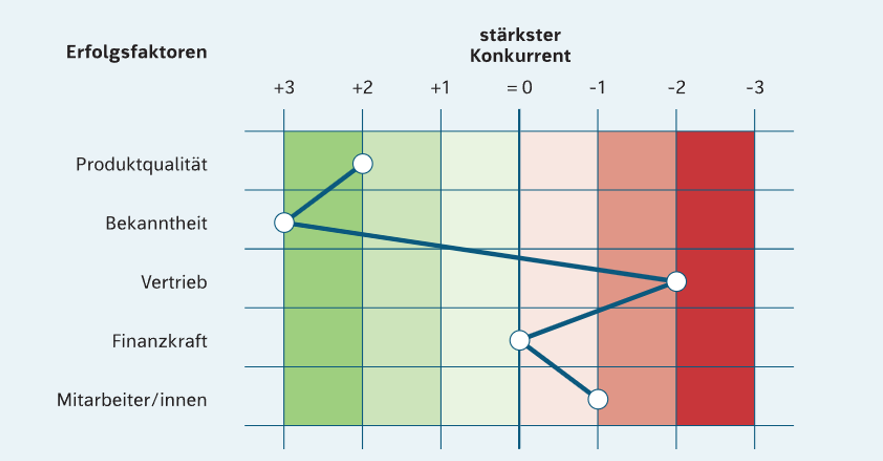 Anhand zentraler Erfolgsfaktoren wie Produktqualität, Bekanntheit, Vertrieb, Finanzkraft und Mitarbeiter:innen. 💼📊