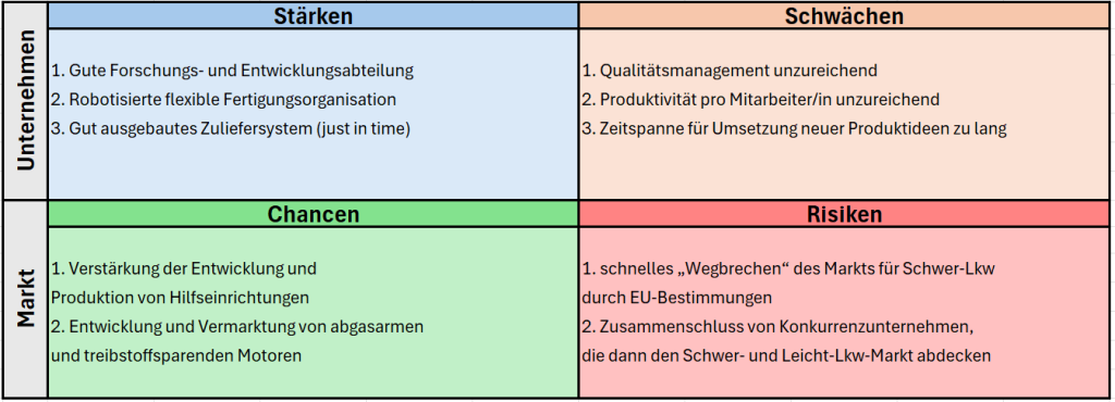 Dieses Beispiel zeigt, wie Unternehmen ihre internen Stärken und Schwächen analysieren und externe Chancen sowie Risiken erkennen können, um strategische Entscheidungen zu treffen.